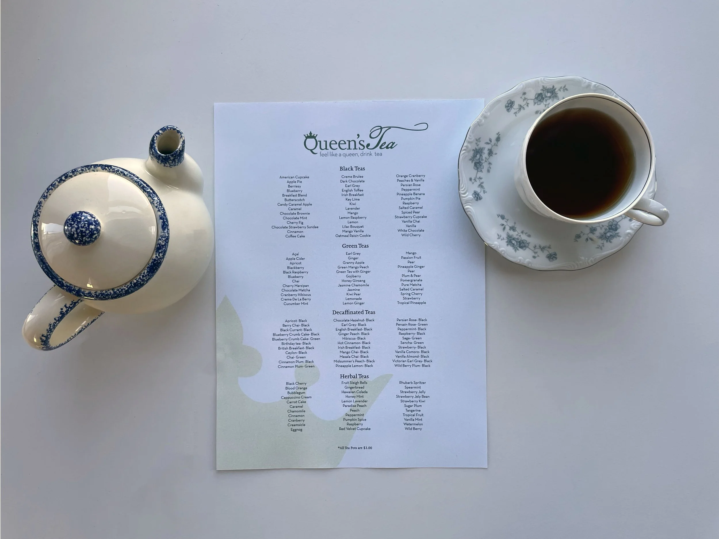 I designed a single page, double sided tea house menu. The front of the menu lists all the teas offered in alphabetical order. On the back, patrons will find additional drinks and the food options. The shop’s logo is located at the top of the menu on the front and back, and is also subtlety incorporated into the background. My design is simplistic yet elegant, which coincides with the idea of the Queen’s Tea shop.